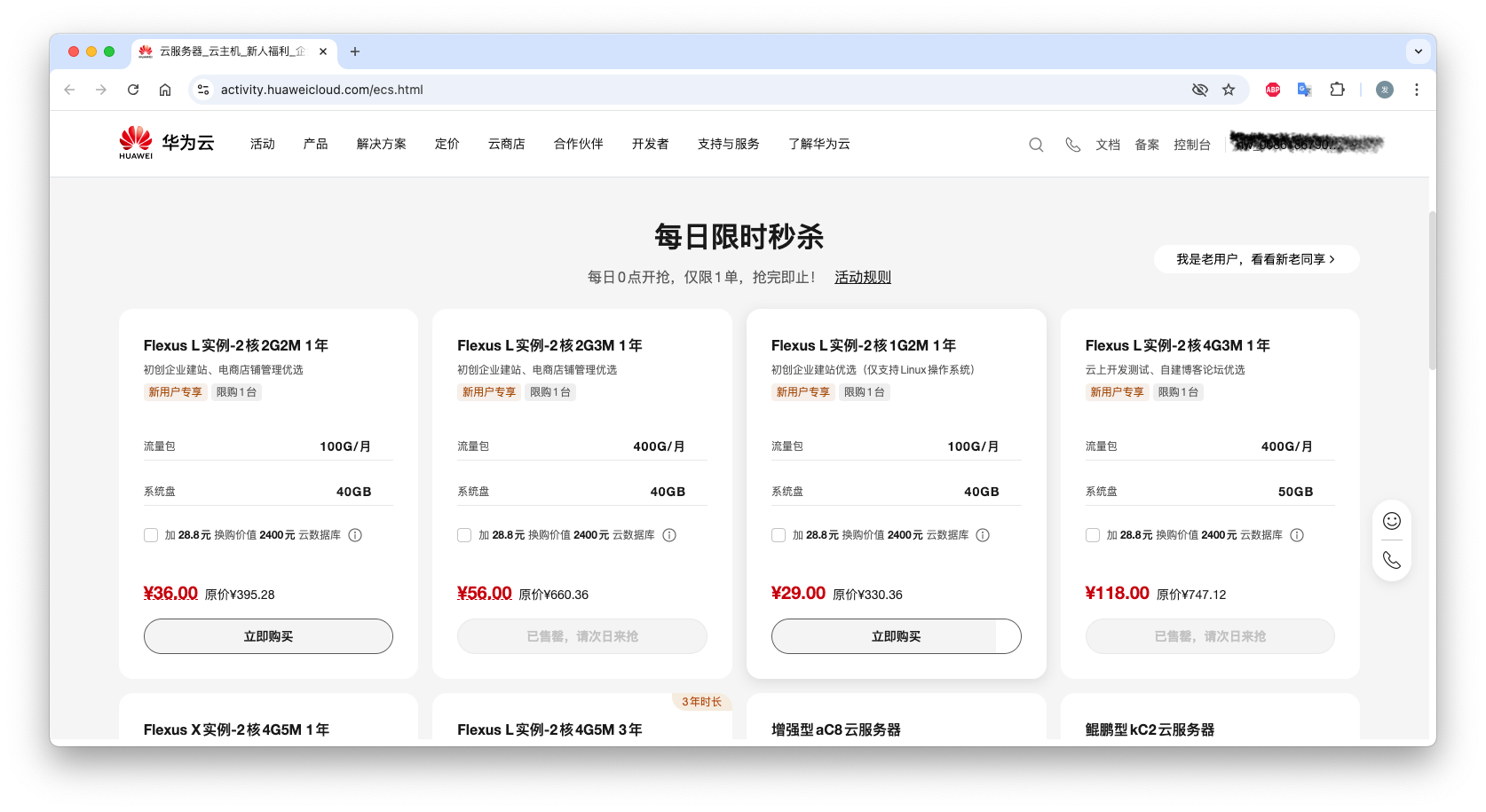 - 购买特价Flexus服务器 ,这里我选择了29元1年的云服务器https://activity.huaweicloud.com/ecs.html